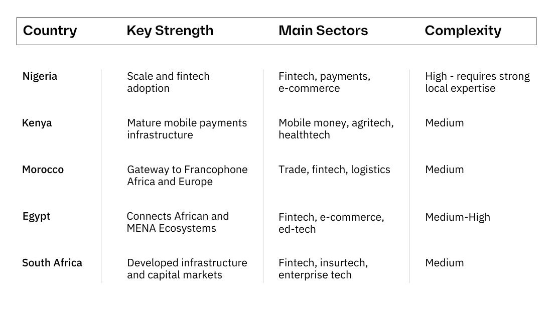 Fintech and technology companies often adopt a regional hub strategy, entering through gateway markets such as Morocco, Egypt, Nigeria, or South Africa before expanding further. These markets typically offer stronger infrastructure, capital concentration, or geographic access to neighbouring regions.